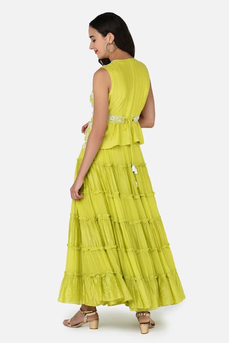 Lime green tiered flared skirt style lehenga. Paired with embroidered shirt kurta with ivory beads and sequins work. Comes with a belt in intricate embroidery details.