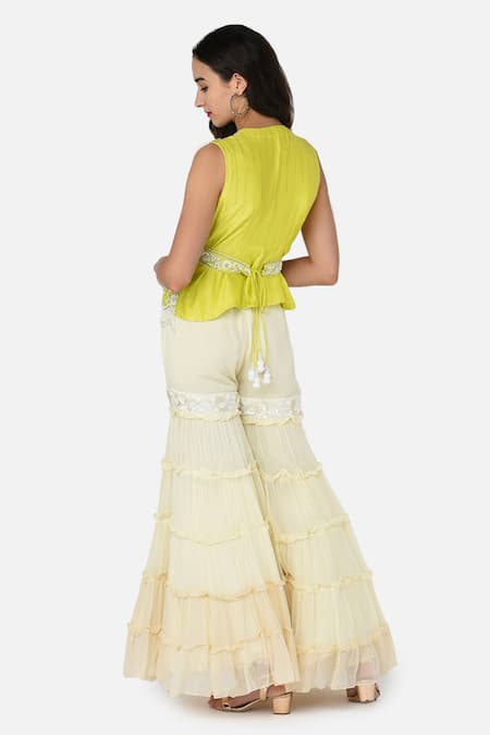 Lime green embroidered short tunic with ivory beads and sequins work. Paired with ivory tier sharara. Comes with a belt in intricate embroidery details.