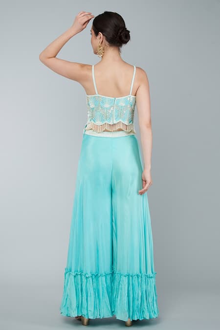 Turquoise georgette embroidered tunic in floral motifs with ivory sequins and beads. Comes with sharara & choker net dupatta.