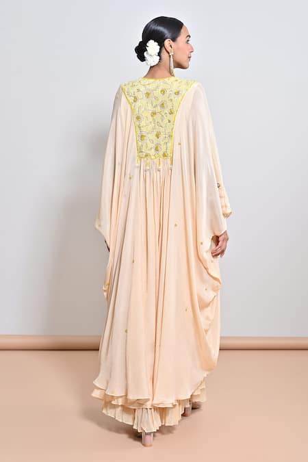 Beige asymmetric tunic featuring bead & sequin hand embroidery in flower pattern. Paired with a layered palazzo.