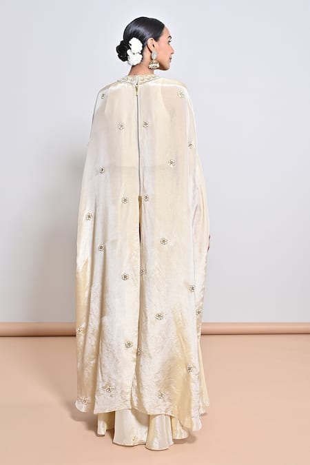 Ivory cape featuring sequin, bead & cutwork hand embroidery in flower motif with long sleeves. Paired with an embroidered palazzo and an inner slip.