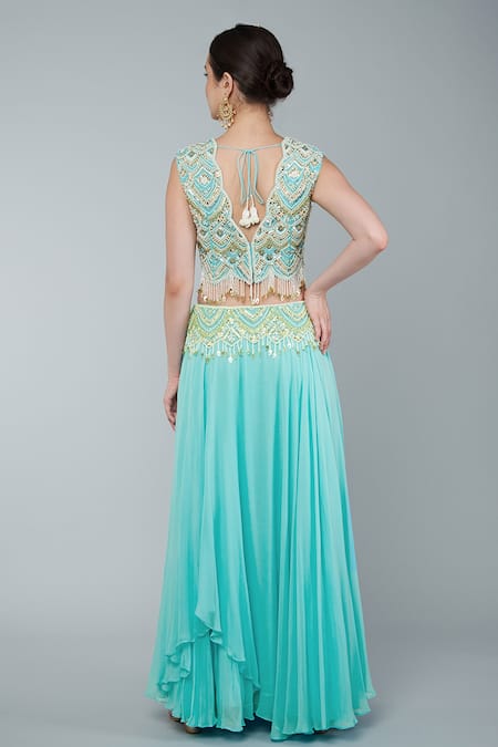 Turquoise georgette layered lehenga with an embroidered, tassel embellished waistband. Comes with embroidered blouse & net choker dupatta.
