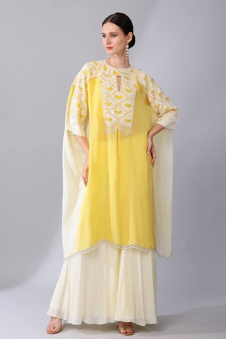 Yellow ombre kaftan featuring batwing sleeves and scallop sequin embroidery. Paired with a flared palazzo and inner slip.