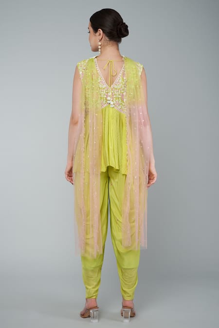 Yellow top featuring floral sequin embellishments and gathered details. Paired with an embroidered dhoti and a choker net dupatta.