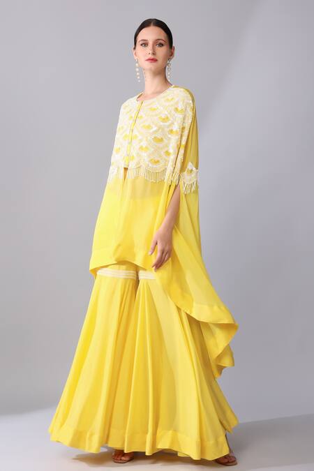 Yellow asymmetric cape featuring scallop embroidery with tonal sequins and glass beads highlights. Paired with a matching sharara for a complete look.