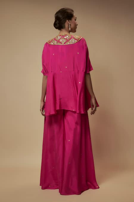 Pink silk tunic featuring sequin bead floral motifs on the yoke with a front slit. Paired with sequined palazzos and an inner slip.