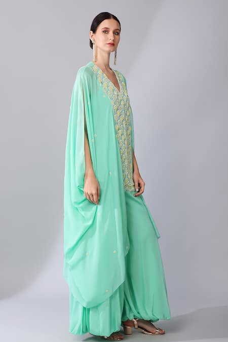 Green tunic featuring cowl statement sleeves and all-over wildflora bloom embroidery with tonal sequins and beads. Paired with a flared palazzo for a complete set.