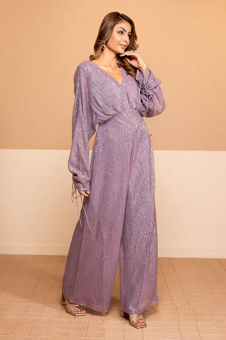Purple Net Cut Work, Embroidery V-neck Ema Shimmer Jumpsuit