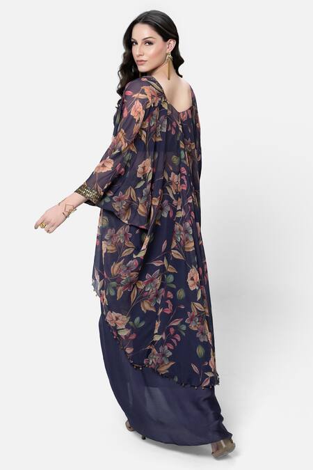 Cadbury purple floral print cape featuring three quarter sleeves and open neckline. Paired with a coordinating blouse and dhoti skirt.