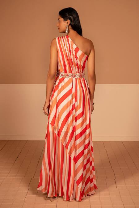 Multi colored one shoulder maxi dress featuring all-over striped prints and a flowy silhouette. Comes with a floral embroidered belt for added elegance.