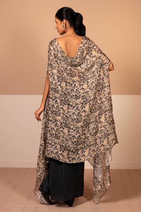 Black Crepe, Chiffon Sequins Open Marble Print Embellished Cape Draped Skirt Set