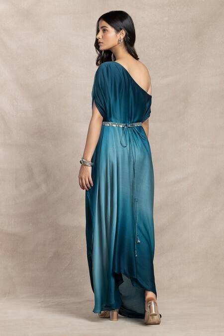 Ocean blue ombre effect draped maxi dress featuring an asymmetric neckline and drop shoulder sleeves. Paired with an embellished belt for added elegance.