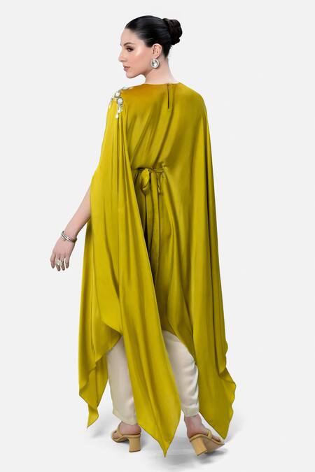 Corn mustard asymmetric kaftan featuring placement embroidery with beads, sequins, and Swarovski. Paired with a matching pant for a cohesive look.