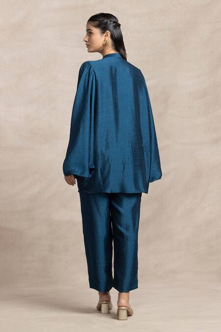 Blue Silk Mandarin Collar Pleated Kaftan Set With Pant