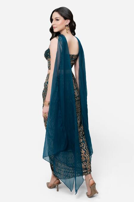 Beaded embroidery on blouse, Abstract print on dhoti skirt, Choker dupatta with printed panel