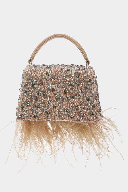 Beige handbag crafted from faux leather with a suede lining and adorned with handcrafted crystal embroidery