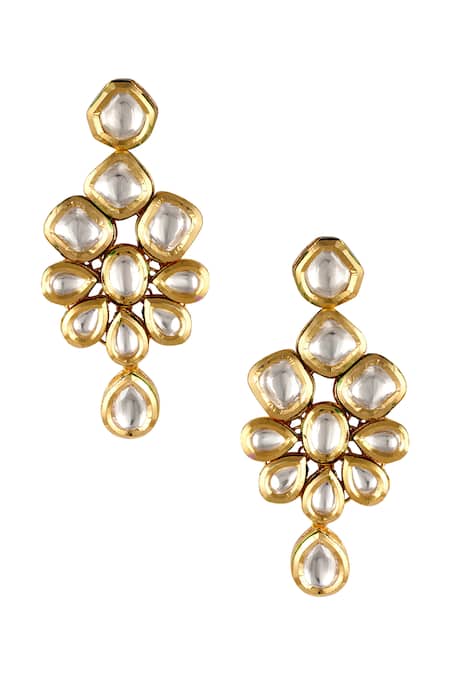 Gold-plated layered necklace featuring encrusted kundan and teardrop motifs. Paired with matching floral dangler earrings.