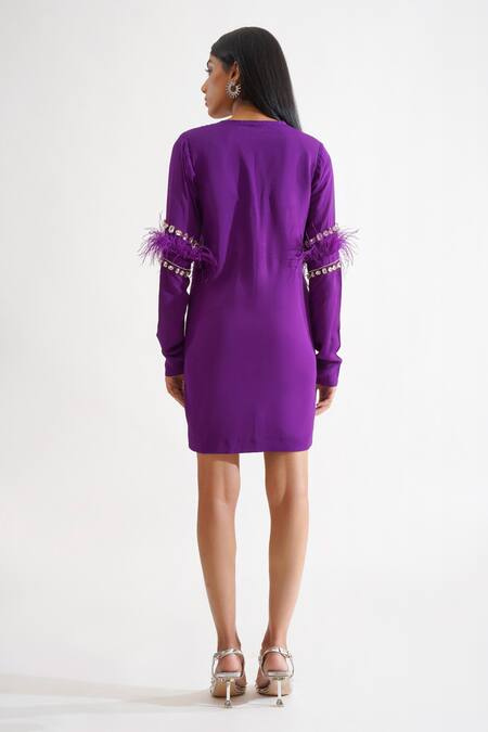 Deep purple dress featuring a V-neckline with crystals and feather embroidery on full sleeves