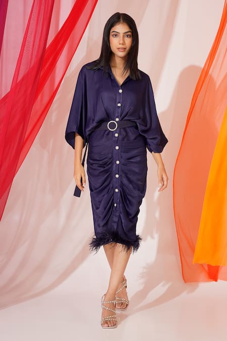 Navy blue pleated dress featuring a collar neckline, batwing sleeves, and front button closure. Paired with a pearl embroidered belt and adorned with feathers at the hem.