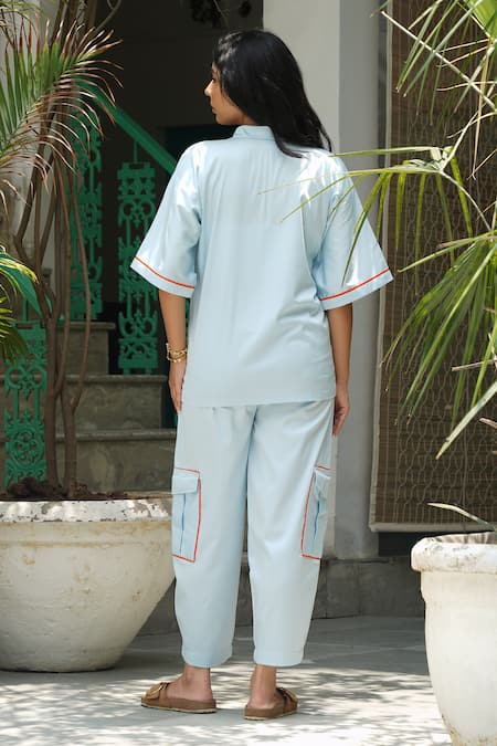 Shop_Keoo_Blue Cotton Collared Contrasting Panel Shirt And Cargo Pant Set