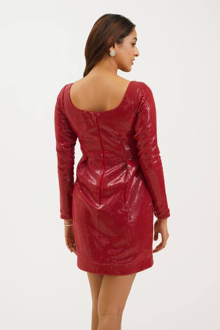 Maroon short skater dress featuring full sleeves and all-over sequin embellishments