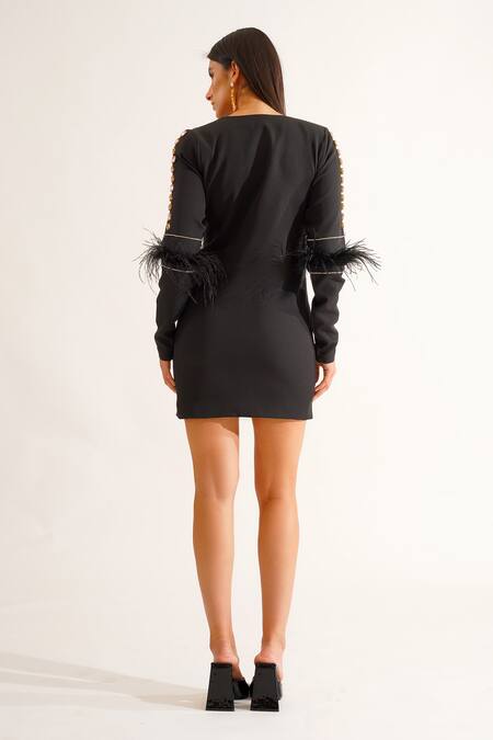Black dress featuring feather embroidery on full sleeves and crystal accents