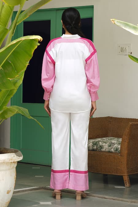 Buy_Keoo_White Cotton Embroidery Collared And Pink Striped Print Shirt & Pant Set_Online_at_Aza_Fashions