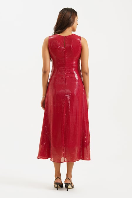 Maroon midi dress featuring 3D flower embellishment and sequence detailing