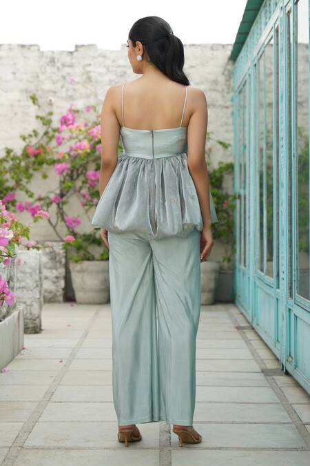 Sea green spaghetti top featuring an embellished balloon hemline. Paired with pleated fabric pant for a complete set.