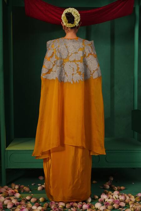 Yellow Silk, Organza, Crepe Applique Round Aaftaab Floral Cape Draped Skirt Set