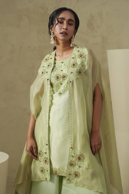 Pear green designer set featuring a cape, kurta, and gharara. The ensemble is made from silk and tissue with intricate handwork details.