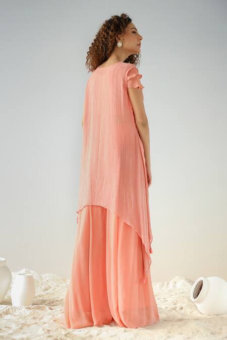 Onion pink cape featuring open front design with inverted pleated details and hand embroidery. Paired with a scalloped embroidered blouse and flared palazzo.