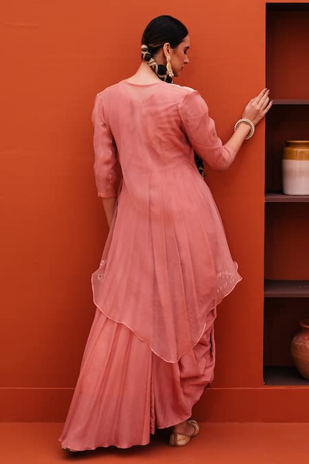 Onion pink gown featuring a sweetheart neckline and cowl drape design. Paired with an embroidered asymmetric hem cape with a V-neckline.