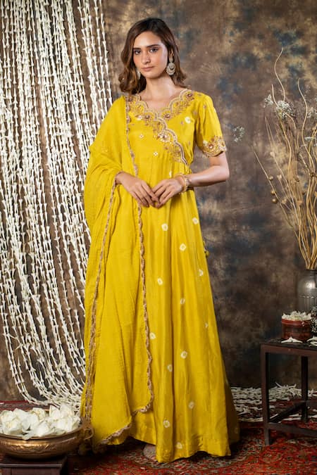 Lime green silk anarkali featuring gota and thread embroidery on the neckline and sleeves. Paired with a mulmul crush dupatta and attached lining.