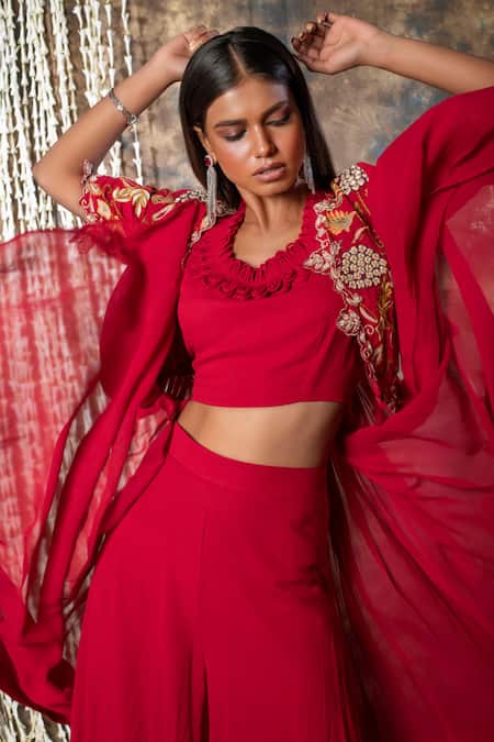 Red georgette crop top featuring a round neckline and sleeveless design. Paired with a flared pant and a short-sleeved jacket adorned with thread and zardosi embroidery.