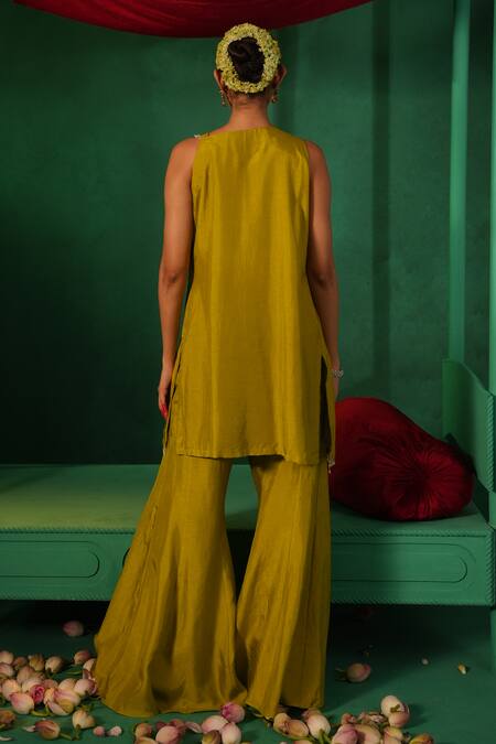 Green silk kurta featuring asymmetric neckline with floral thread embroidery, sequins, and beads. Paired with coordinating bell bottom pant for a stylish look.