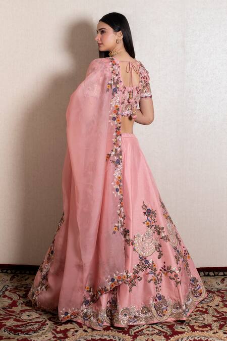 Pink lehenga featuring flower and thread embroidery with a round neckline. Paired with a matching blouse and sheer dupatta with cutwork border.