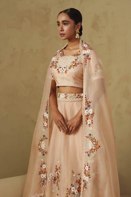 Intricate floral handwork embroidery on blouse and lehenga, Lace detailing along the edges of the dupatta, Hook & chain closure for secure fit