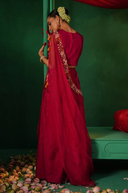 Red Silk, Organza Beads, Embroidery Round Masakali Solid Pant Tasselled Sash Set