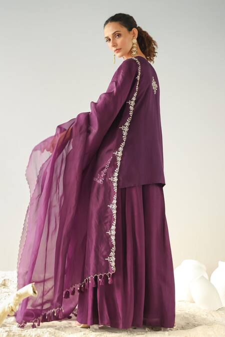 Purple kurta featuring round neckline, three quarter sleeves, and hand embroidered floral patterns with mirror and zari work. Paired with bias cut flared pant and a dupatta with tasselled and cut work border.