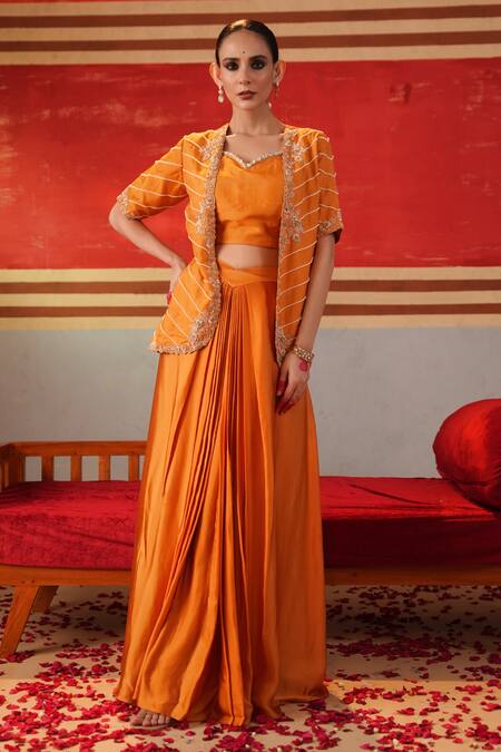 Rust orange jacket featuring moti work with a floral embroidered hem. Paired with an embroidered neck blouse and a cowl pleated skirt.