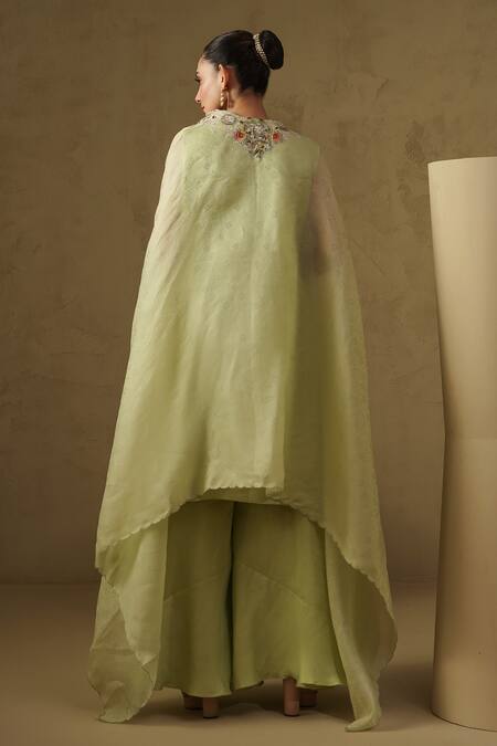 Pista green kurta featuring handwork embroidery and a flowy silhouette. Paired with a matching jacket and pant for a complete look.