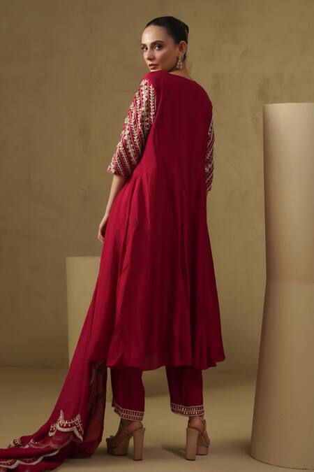 Red silk anarkali featuring hand embroidery on the sleeves and neckline. Paired with matching pants and a dupatta with intricate detailing.