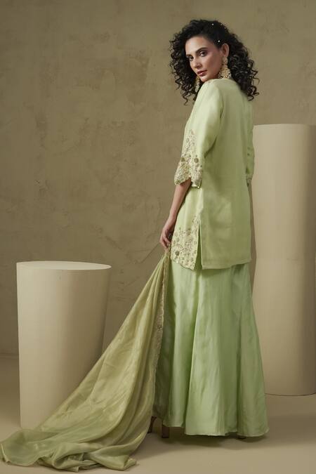 Pista green kurta featuring handwork embroidery and a V-neckline. Paired with matching pant and dupatta in silk and tissue fabric.