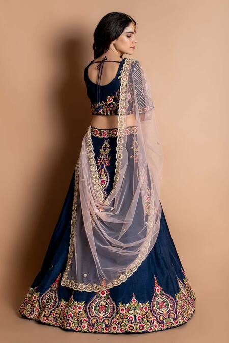 Blue Bamboo, Silk, Net Embroidery Round Neck Thread Blouse Lehenga Set