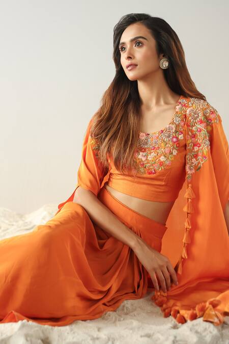 Orange skirt set featuring a hand embroidered blouse with floral motifs and an open cape. Paired with a pleated draped skirt and detailed with fringe tassels and cut work hem.