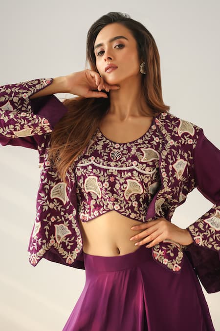 Purple floral thread embroidered jacket featuring bell sleeves and open front. Paired with a matching blouse and asymmetric layered skirt.