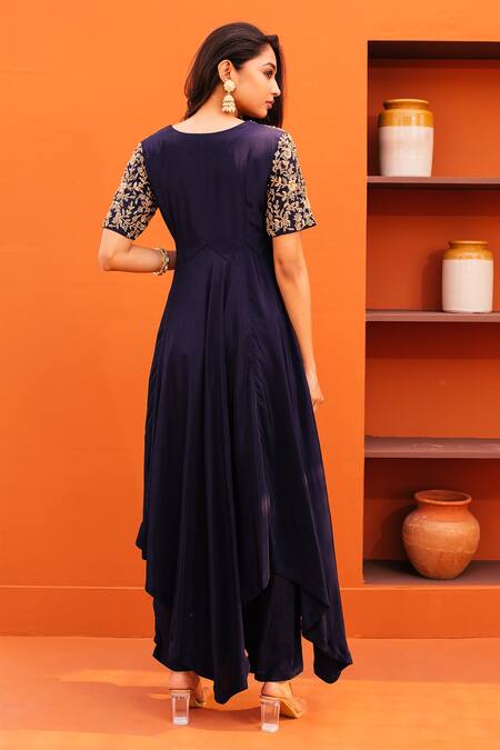 Midnight blue crepe embroidered yoke kurta with asymmetric hem detailing. Paired with a pant featuring floral embroidery detailing.