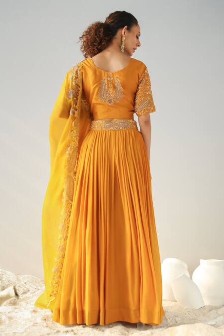 Yellow Silk, Organza, Georgette Zari, Metallic Embroidered Blouse Lehenga Set