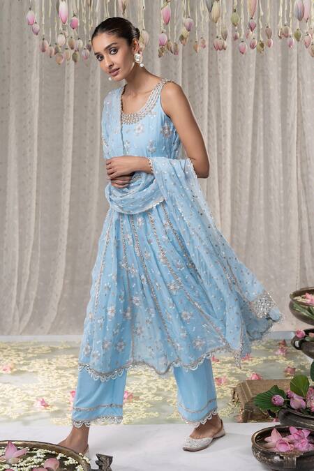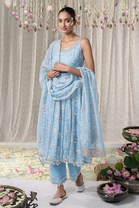 Blue sleeveless anarkali with thread, zari embroidery in floral pattern. Paired with pant & dupatta.